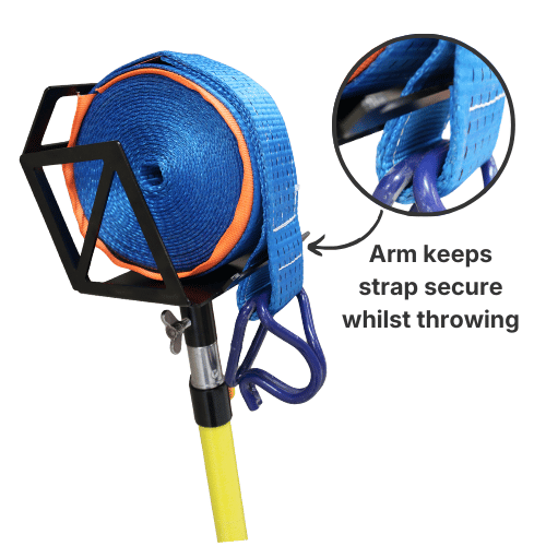 This strap thrower, launches the strap in a straight line, eliminating annoying twists in your straps. It also reduces safety hazards, by easily placing the straps in high and hard to reach position, staying compliant with any ‘boots on the ground’ policy. The arm keep the strap secure whilst throwing, ensuring the strap does not fly out of the thrower. The heavy-duty metal head construction provides greater strength and longevity than plastic strap throwers.